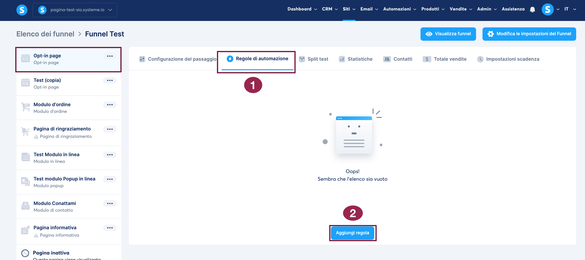 Navigate nella vostra opt-in page nell'editor del funnel, fate clic sulla scheda "Regole di automazione" (numero 1 nell'immagine) e poi su "Aggiungi regola" (numero 2 nell'immagine).