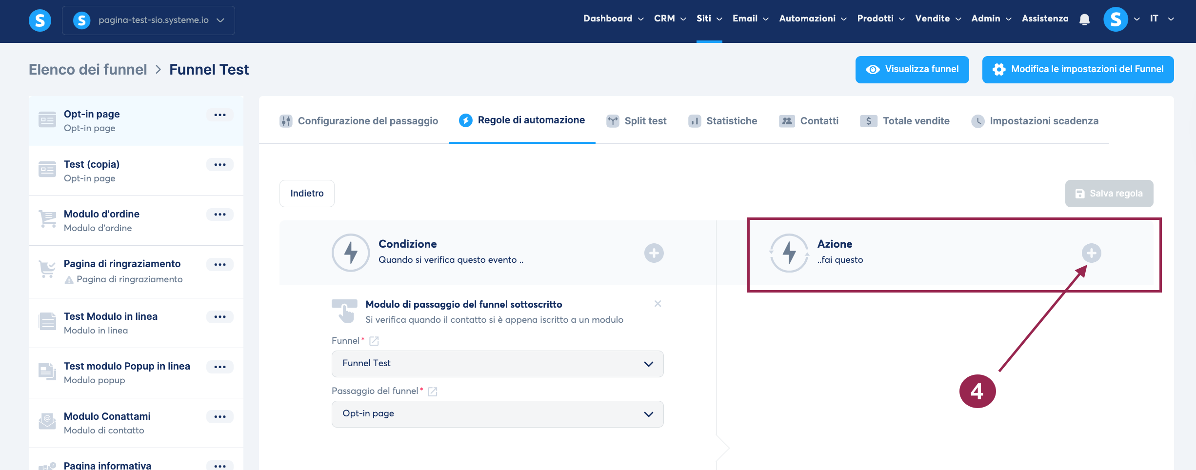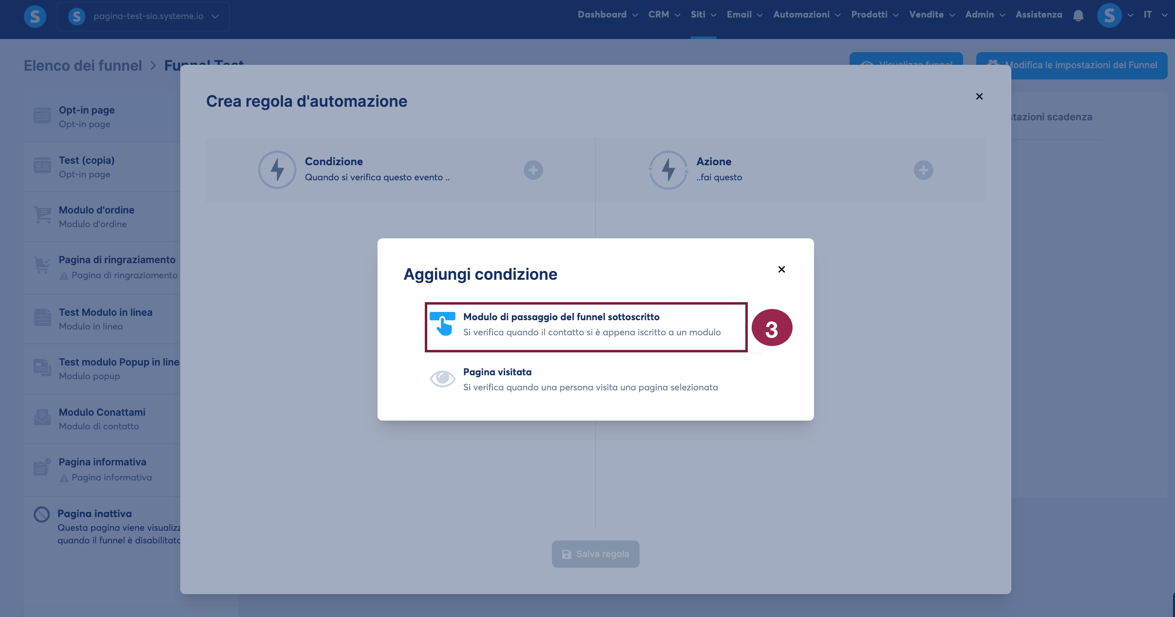 Nel popup "Aggiungi condizione" che appare, scegliete "Modulo al passaggio del funnel sottoscritto" (numero 3 nell'immagine).