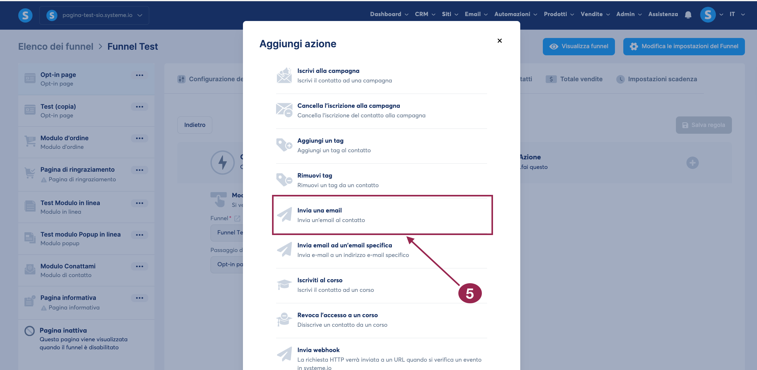A questo punto scegliete l'azione "Invia una email" (numero 5 nell'immagine).