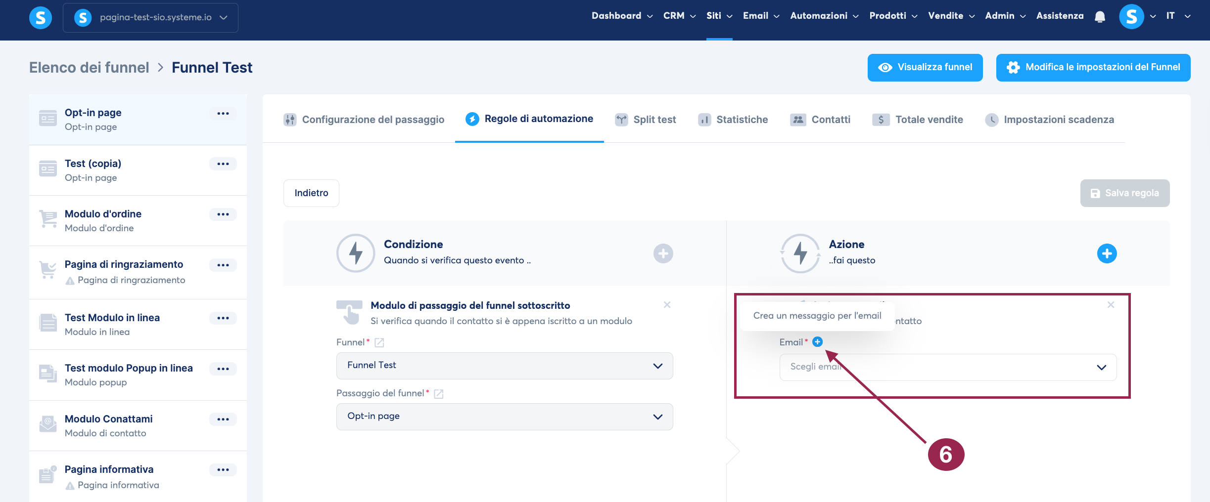 Dopo aver aggiunto le azioni, cliccate sull'icona "+" per creare l'e-mail (numero 6 nell'immagine).