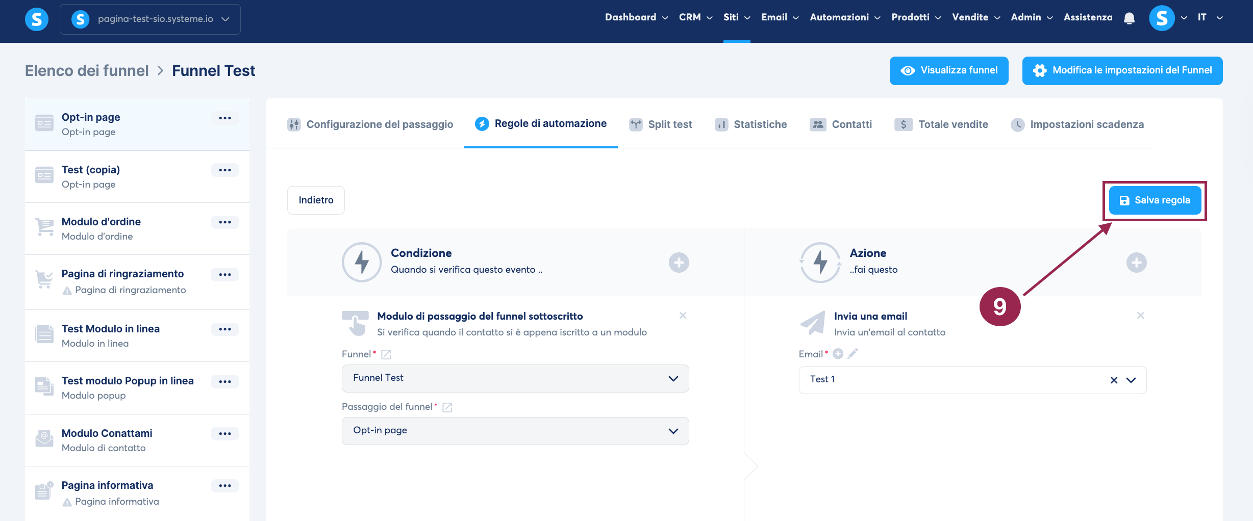 Al termine, fare clic su "Salva regola" (numero 9 nell'immagine). Per tornare alla scheda principale delle regole di automazione, dove è visualizzata l'intera regola, fare clic su "Indietro".