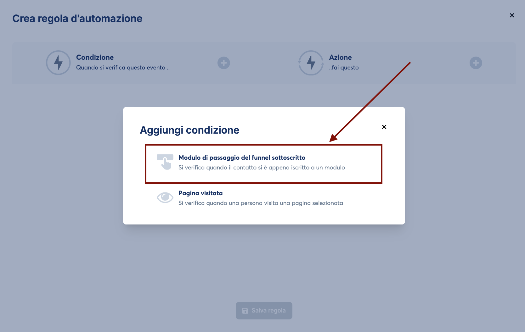 Nella finestra popup che appare, scegli con il tasto "+" come condizione "Modulo di passaggio del funnel sottoscritto"
