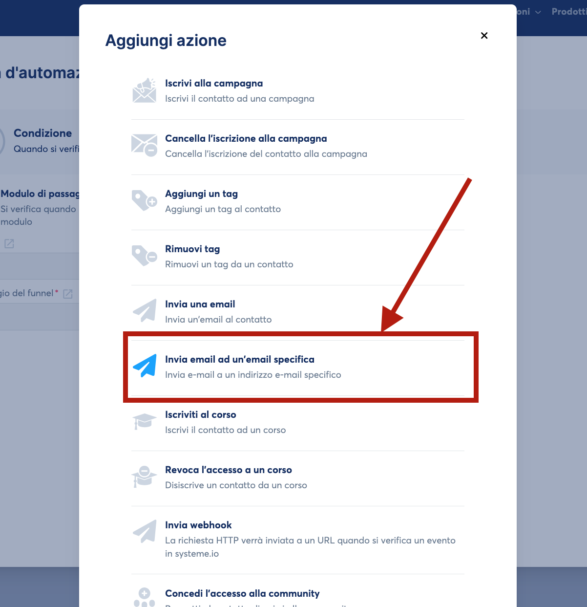 Di seguito scegli con il tasto "+" come azione "Invia e-mail ad un'e-mail specifica"
