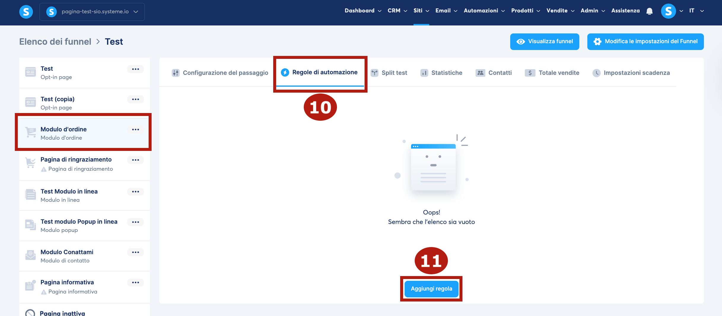 Nelle impostazioni dei passi del modulo d'ordine, fai clic sulla scheda "Regole di automazione" (numero 10 nell'immagine) e poi su "Aggiungi regola" (numero 11 nell'immagine).