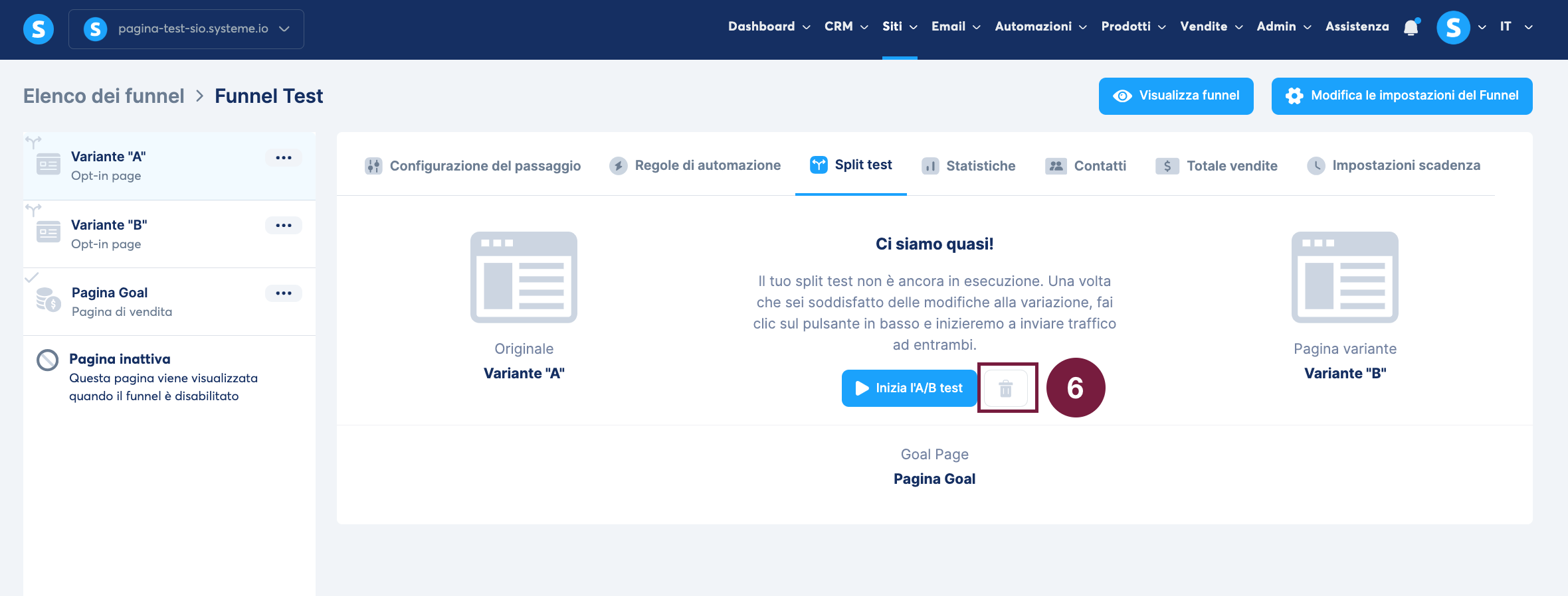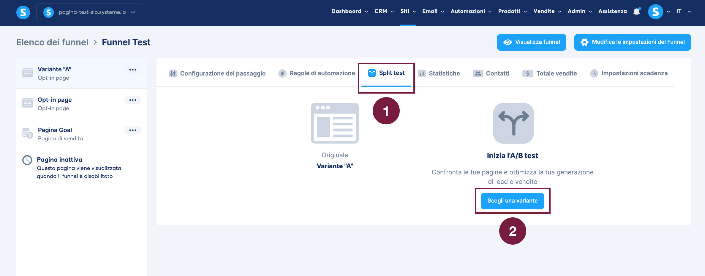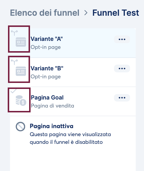 Per creare un test A/B tra la "Variante A" e la "Variante B", entrambe le pagine devono esistere all'interno del funnel di vendita.