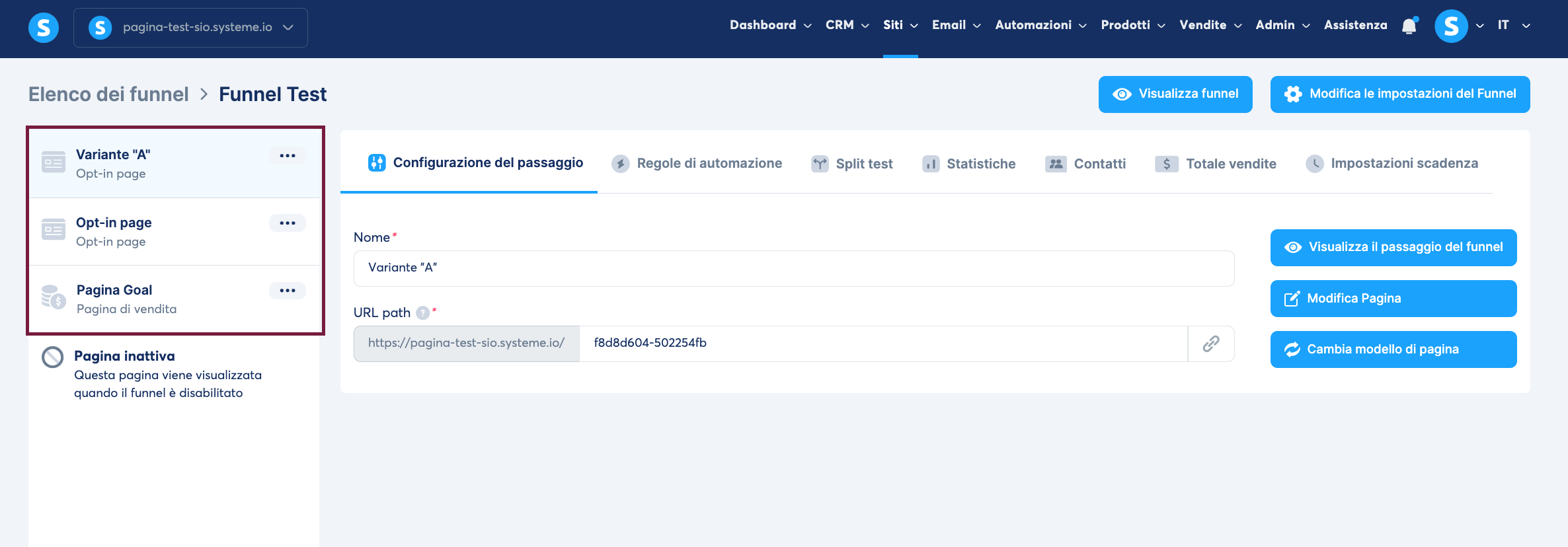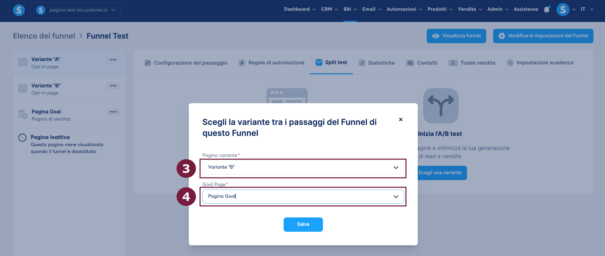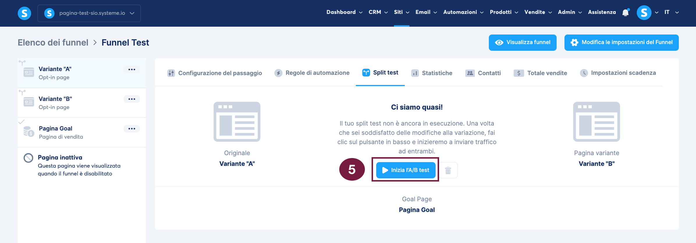 Per creare un test A/B tra la "Variante A" e la "Variante B", entrambe le pagine devono esistere all'interno del funnel di vendita.