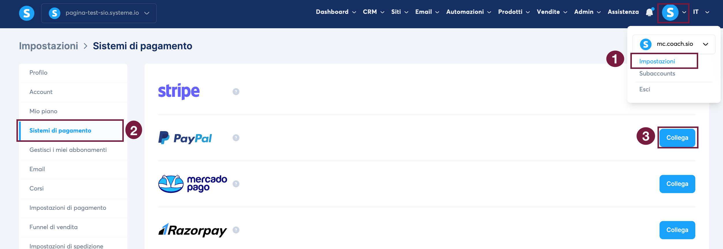 Per collegare il tuo account PayPal con systeme.io, vai sulla tua immagine del profilo e clicca su "Impostazioni" (numero 1 nell’immagine).