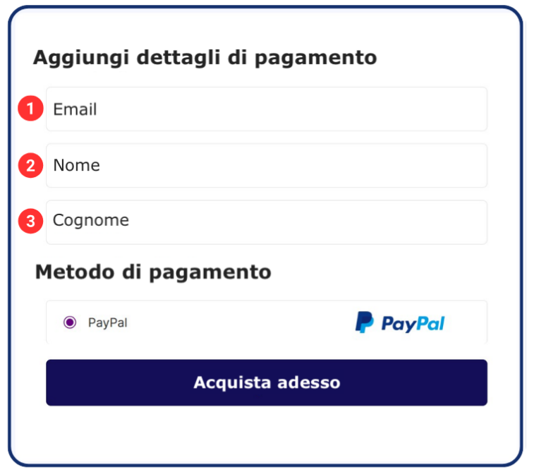 Nota: Per elaborare i pagamenti tramite PayPal, devi aggiungere i campi email (1), nome (2) e cognome (3) a tutti i tuoi moduli d’ordine.
