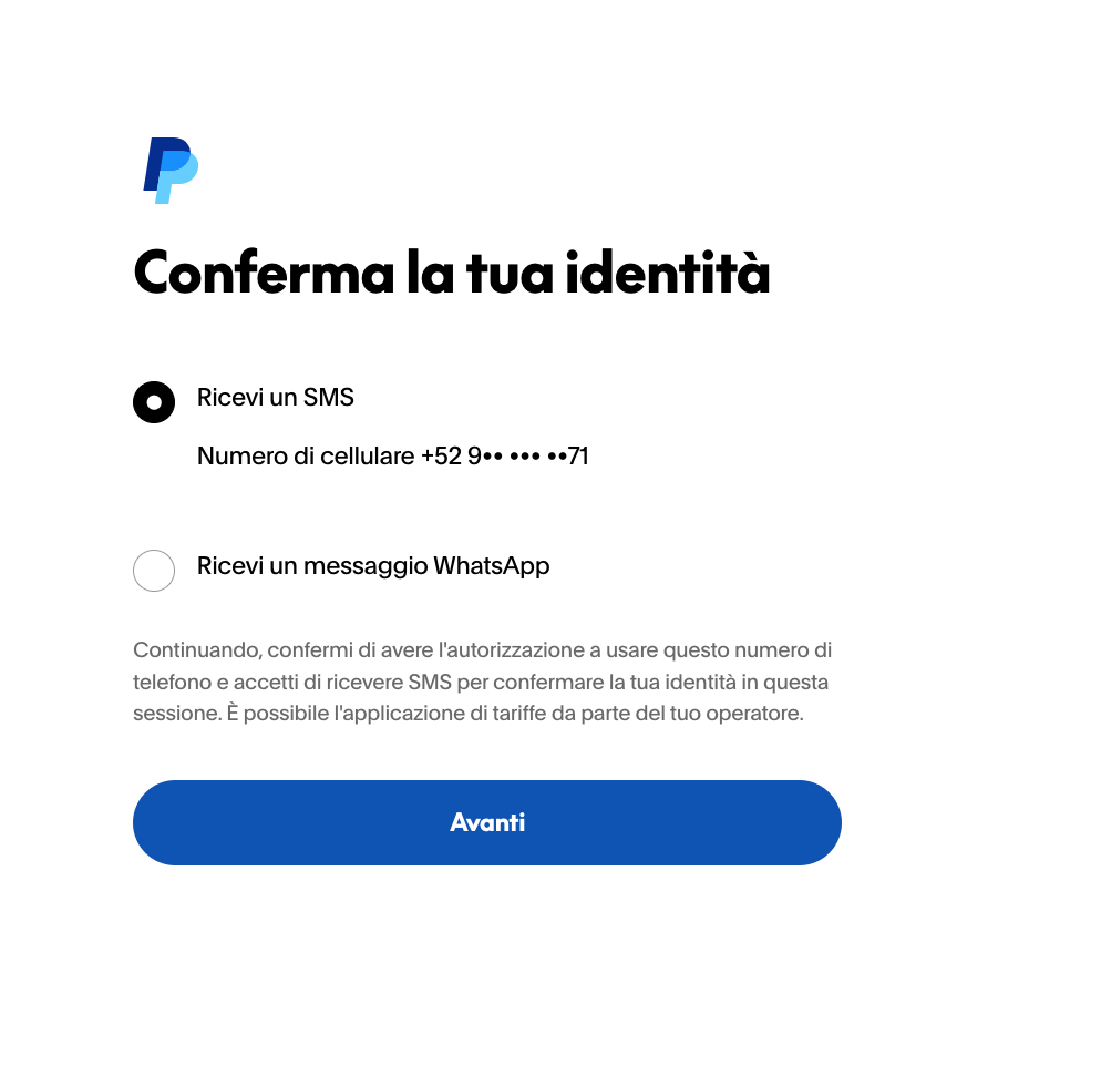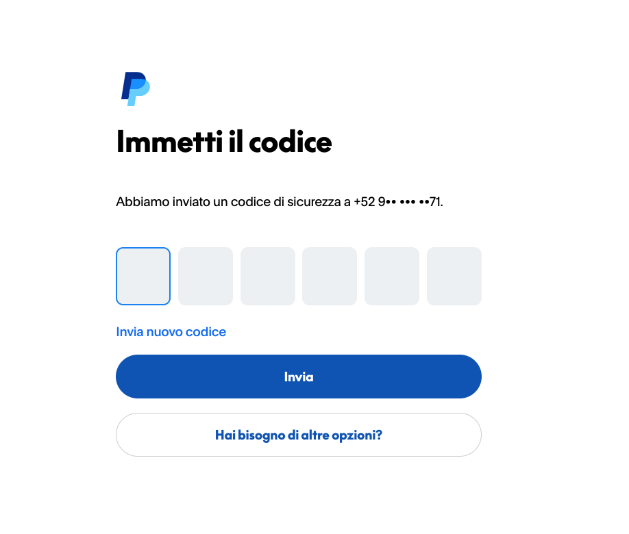 Se hai attivato l’autenticazione a due fattori (2FA) sul tuo account PayPal, ti verrà chiesto di verificare la tua identità inserendo un codice di sicurezza inviato al tuo Telefono o WhatsApp.