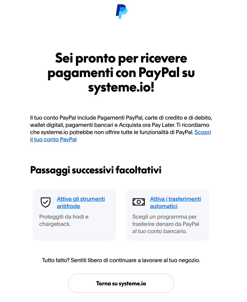 Dopo aver concesso l’autorizzazione, PayPal confermerà che la connessione è pronta. Clicca su "Torna a systeme.io" per rientrare nel tuo account systeme.io.