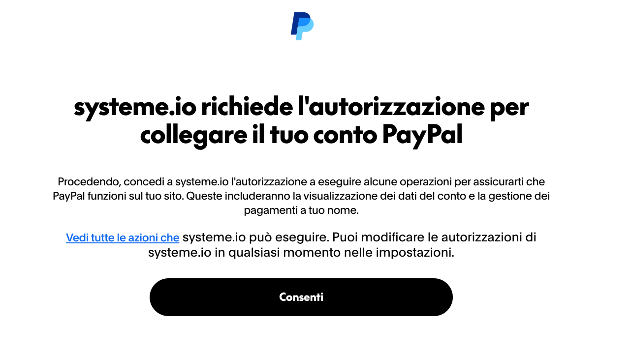 Una volta effettuato l’accesso, PayPal mostrerà una schermata di autorizzazione chiedendoti di permettere a systeme.io di collegarsi al tuo account. Clicca sul pulsante "Consenti" per concedere l’autorizzazione.