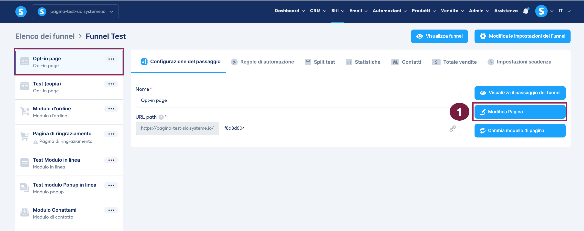 - Clicca sulla fase del funnel in cui si intende attivare il double opt-in e clicca su "Modifica pagina" (numero 1 nell'immagine).