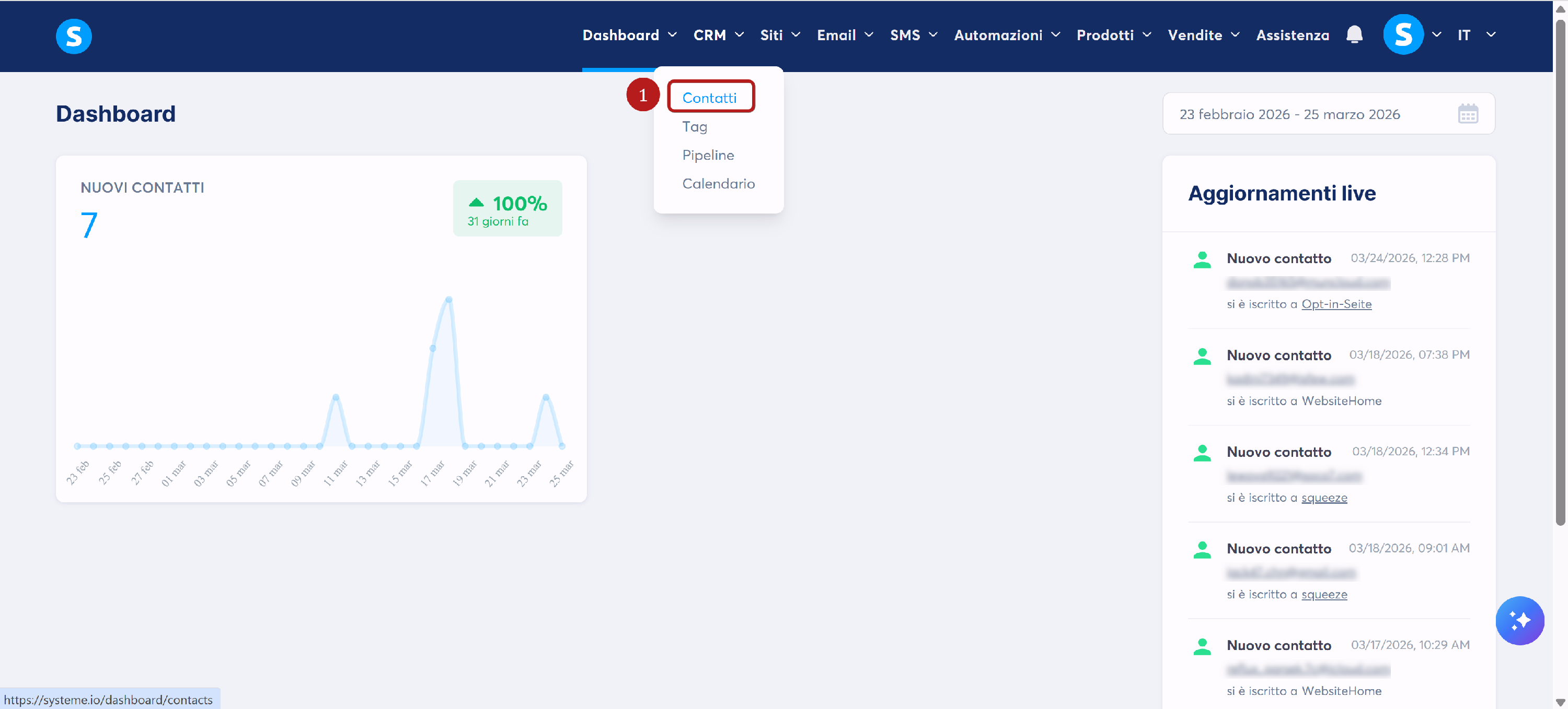 Fai clic su Contatti (1) nel menu CRM.