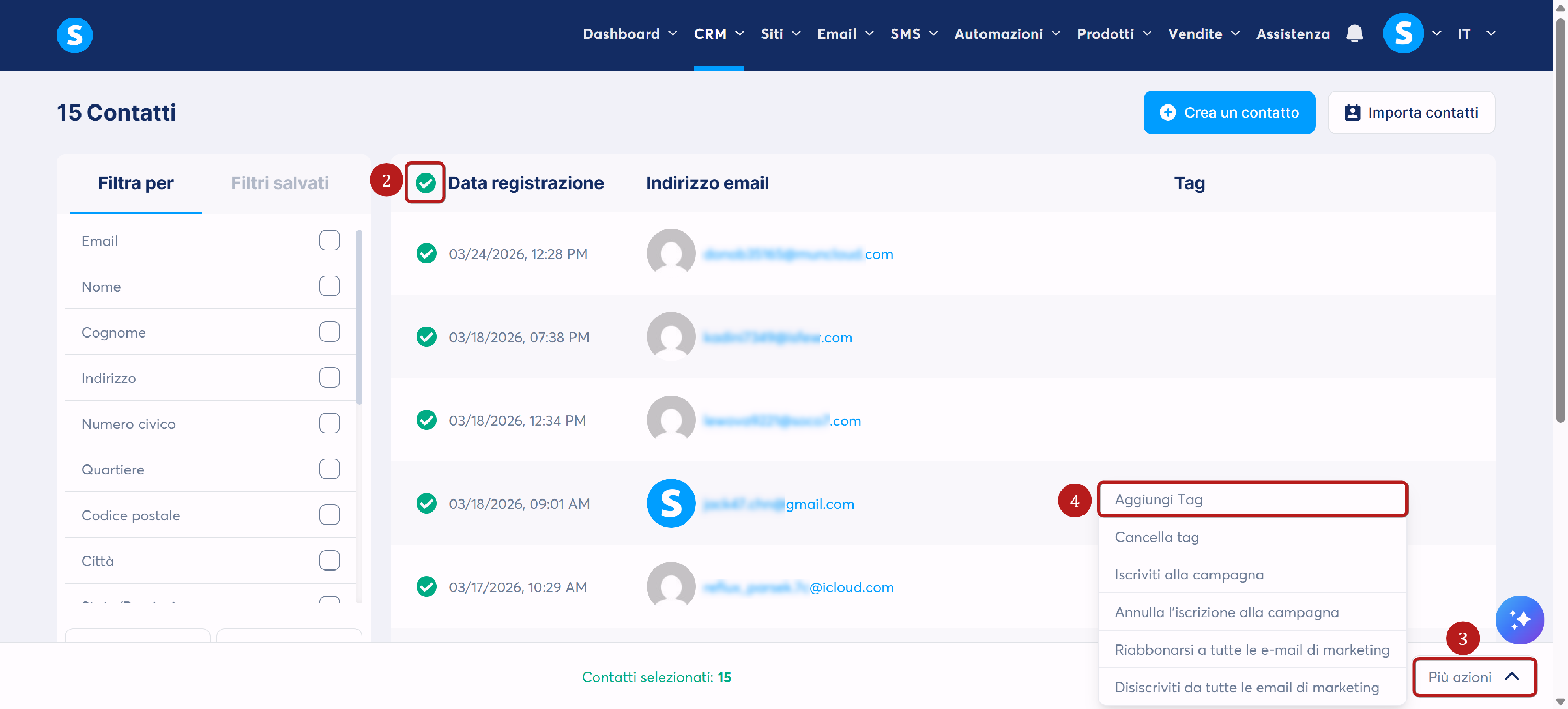 Seleziona il/i contatto/i a cui vuoi assegnare il tag (2), quindi fai clic su Altre azioni (3) e scegli Aggiungi tag (4).