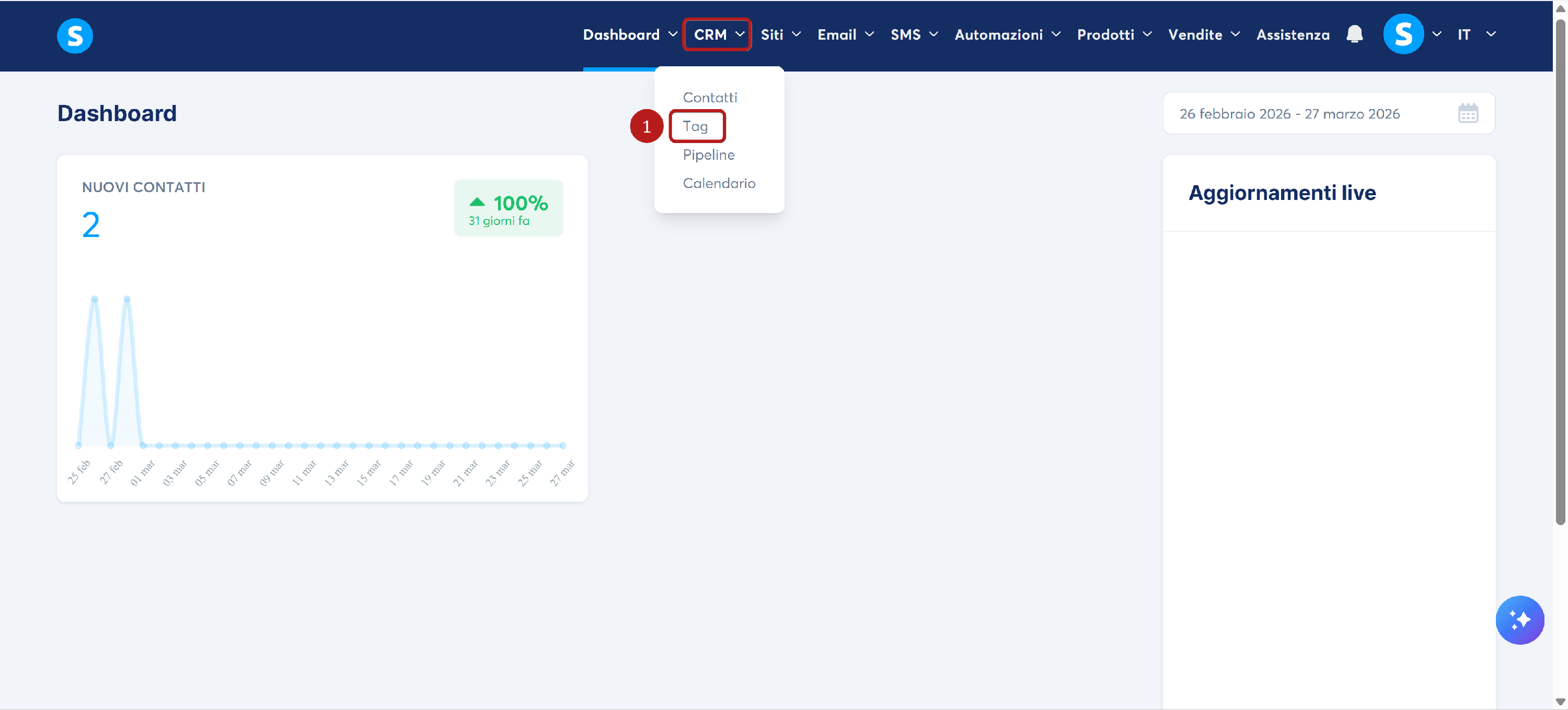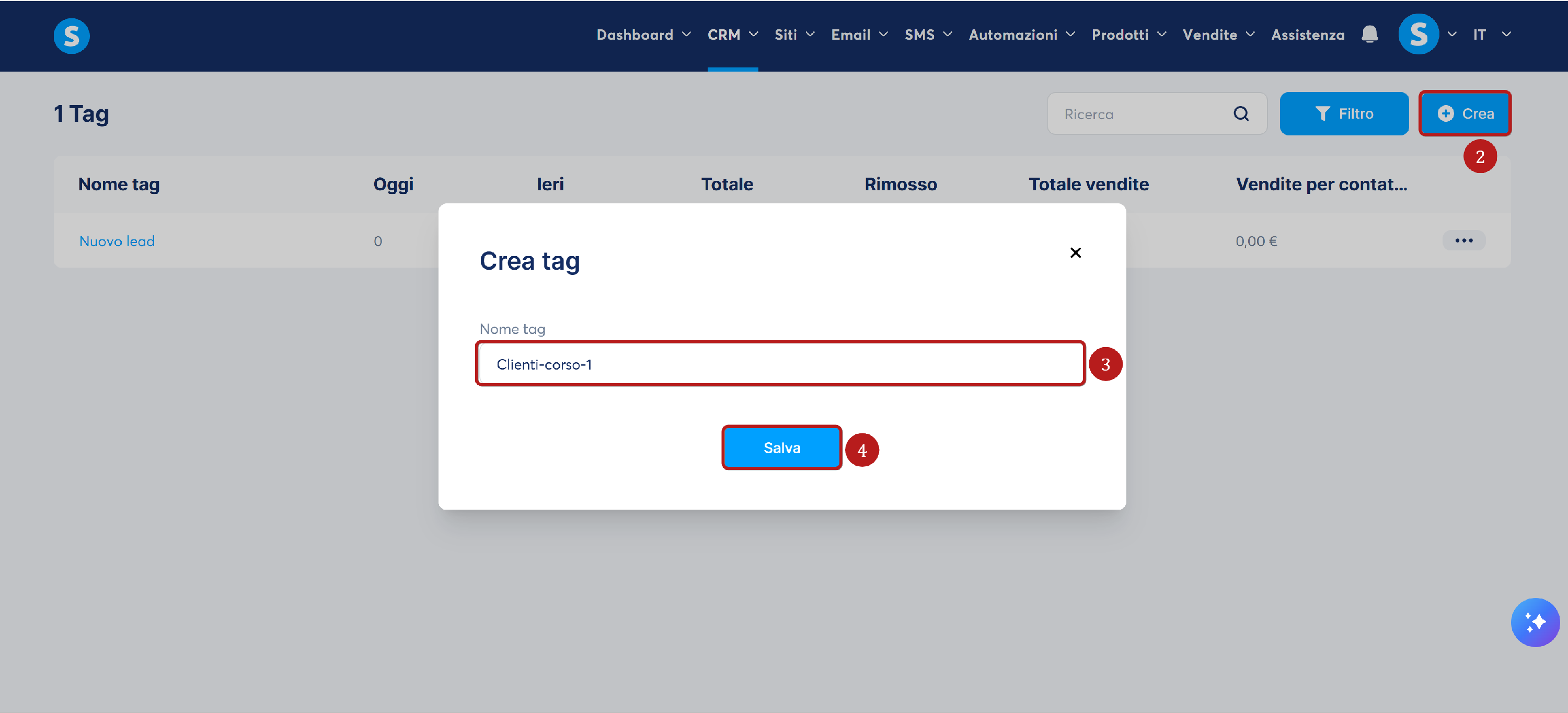 Per creare un tag, vai alla scheda CRM e fai clic su Tag (1).