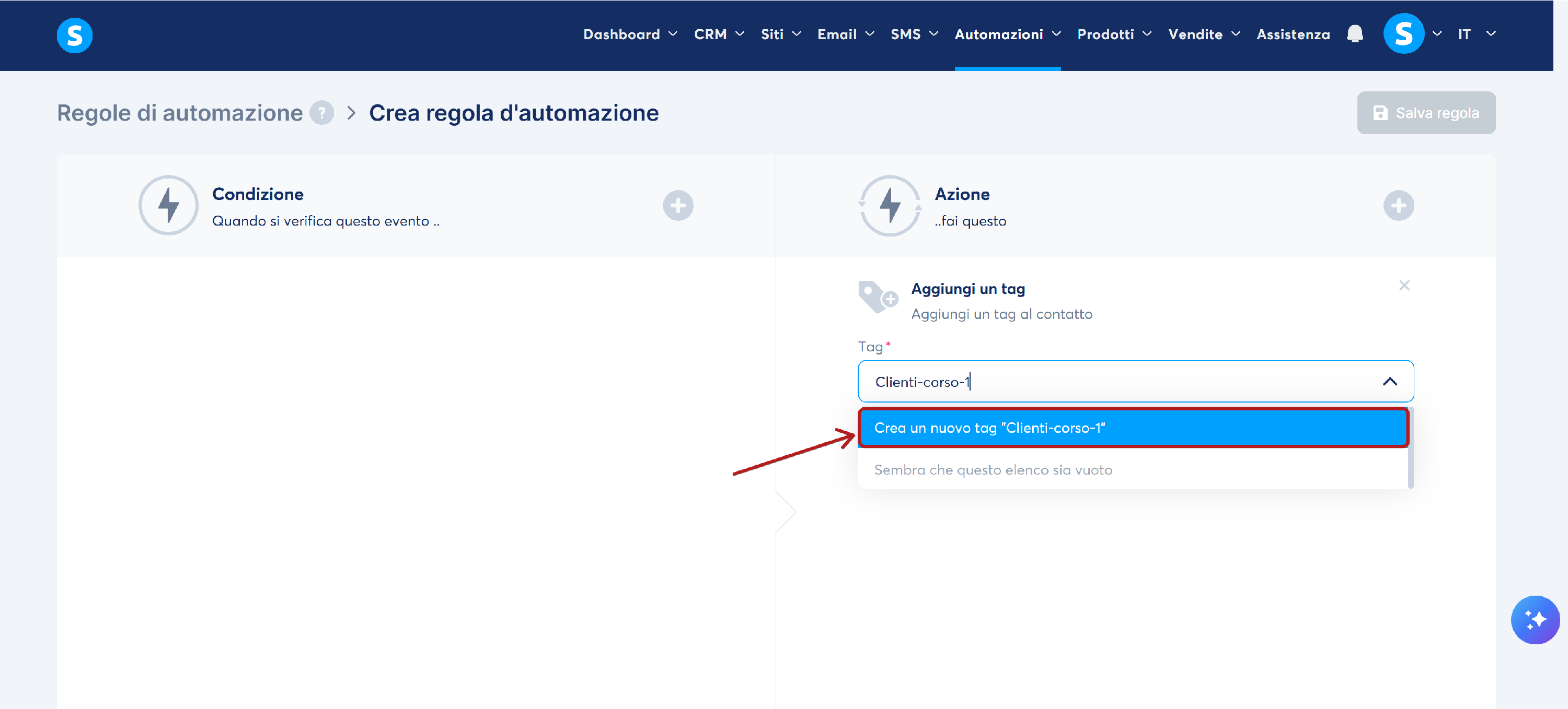 Puoi anche creare un nuovo tag direttamente all’interno delle regole di automazione. Ti basta inserire il nome del tag che vuoi creare e utilizzare nella regola di automazione, e verrà creato automaticamente.