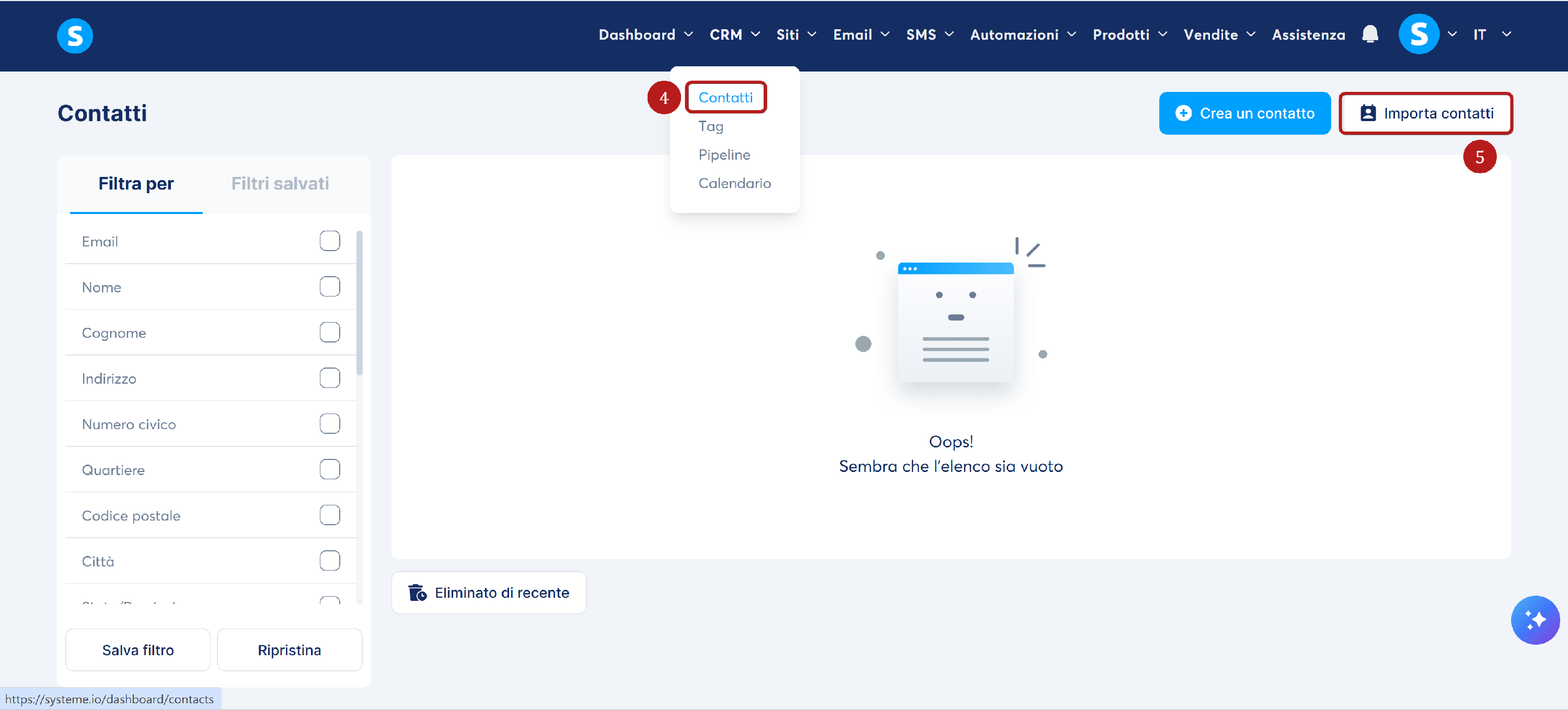 Vai su Contatti (4) nella scheda CRM, poi fai clic su Importa contatti (5).