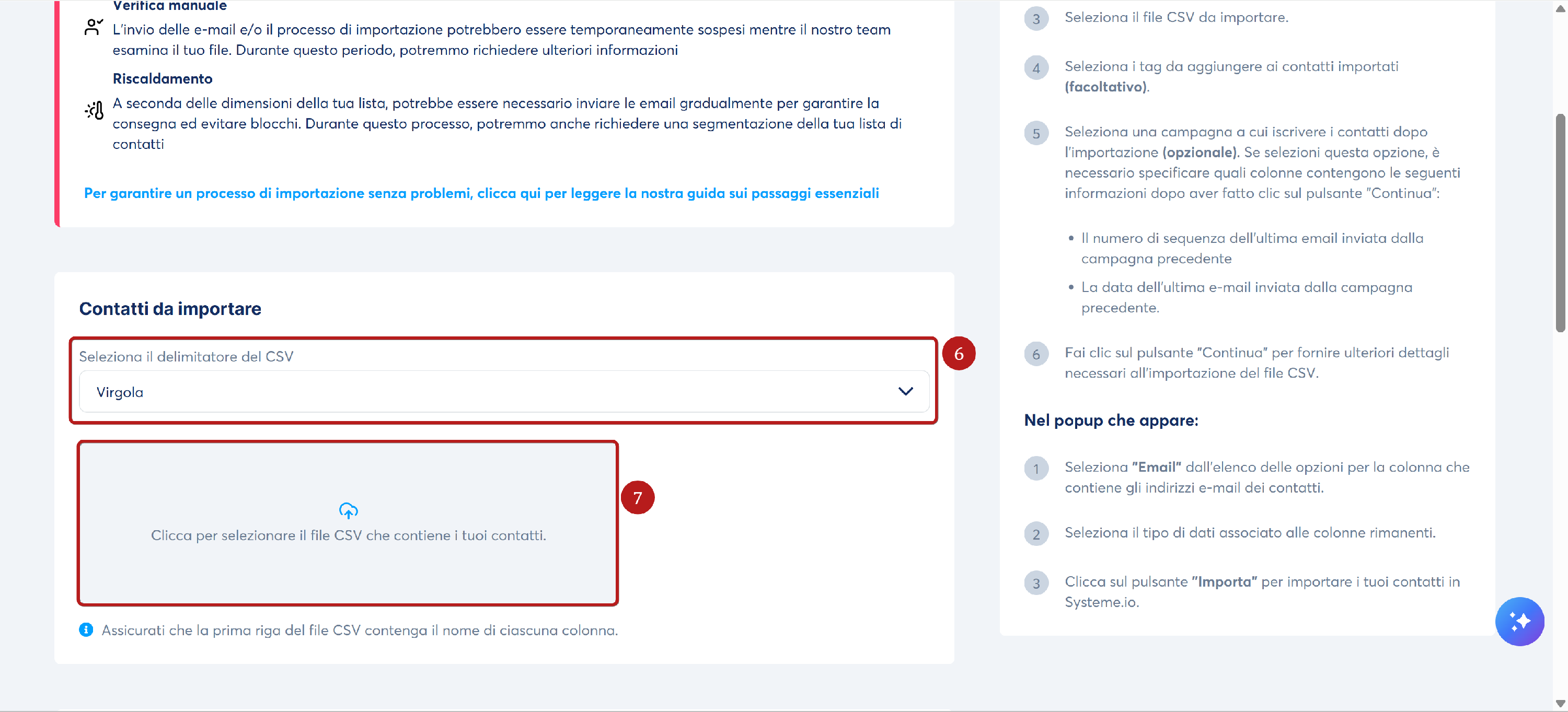 Vai su Seleziona delimitatore CSV (6) per specificare il delimitatore utilizzato nel tuo file CSV (virgola, punto e virgola o barra verticale), e fai clic sulla casella con la dicitura: Clicca per selezionare il file CSV che contiene i tuoi contatti (7) per caricare il file.