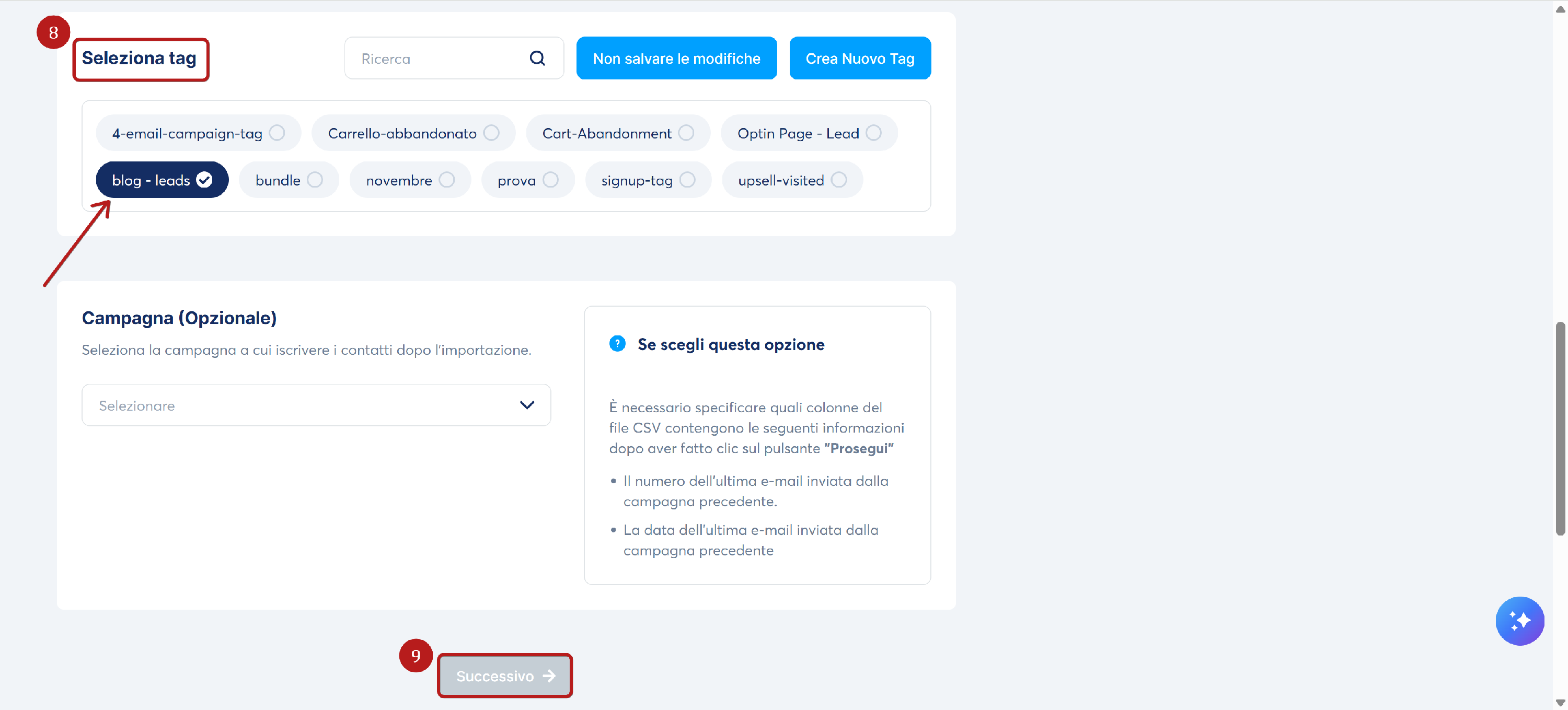 Puoi selezionare il tag da assegnare a questi contatti (8), poi fai clic su Avanti (9).