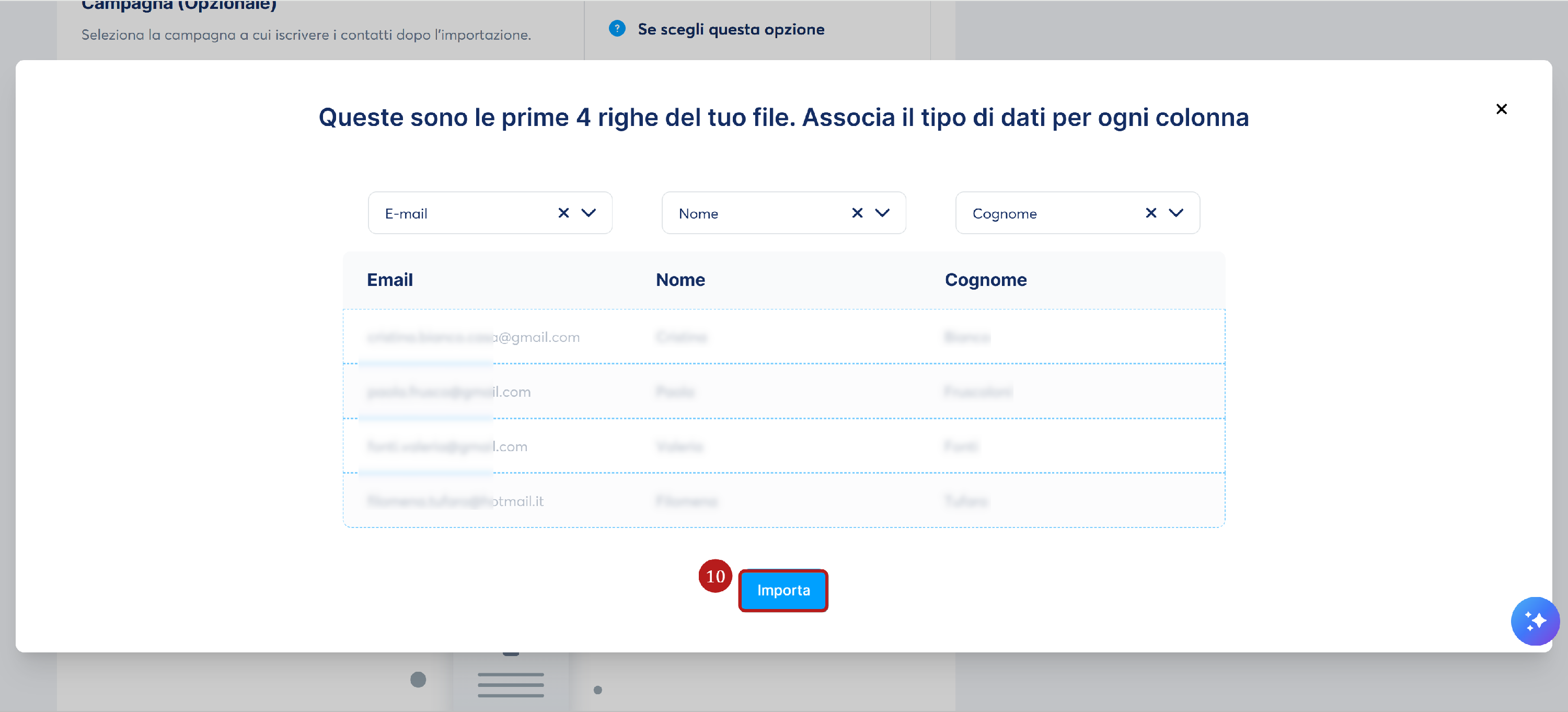 Dopo aver fatto clic su Avanti, apparirà un pop-up dove potrai scegliere il tipo di dati di ciascuna colonna, come Email, Nome e qualsiasi altra colonna pertinente del tuo file.