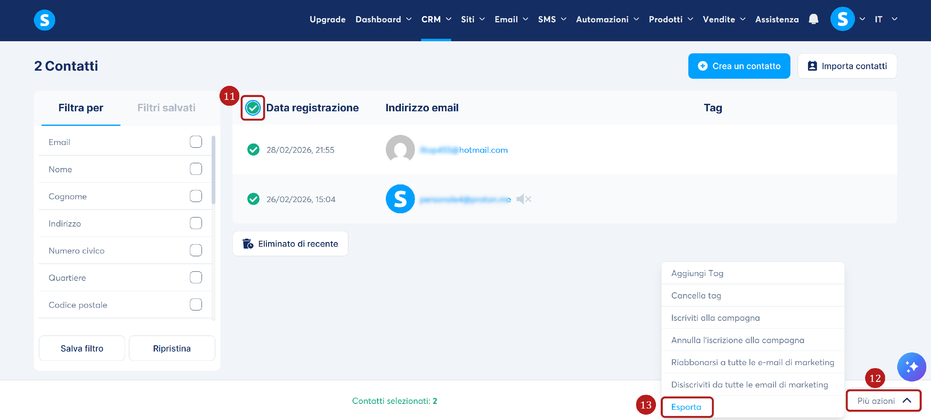 Seleziona i contatti che vuoi esportare (11), poi fai clic su Più azioni (12). Dall'elenco delle azioni, fai clic su Esporta (13).